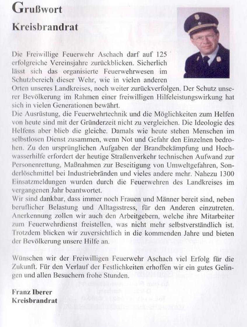 Grußworte vom 125 jährigen Gründungsfest der FFW Aschach